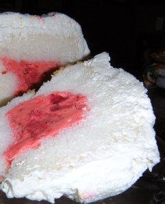 Dissolve Jello in a bowl, using the amount of boiling water indicated in the package directions. Do not add the cold water too ( the Jello is concentrated by 1/2). Chill for about an hour. It should thicken, but not set. Whip the jello with a whisk or low-speed electric mixer, and fold in about 3/4 cup of the whipped cream. Reserve the rest of the whipped cream to frost the cake. Next, fold the drained strawberries into the Jello. Mixture should partially set. Refrigerate longer if it is too liquid, so it doesn’t drain through the cake. Set the Jello mixture aside. Slice off top 1/3 of the angel food cake and set it aside. Using clean fingers, dig out a trench in the lower 2/3 of the cake, leaving 1- 1 1/2″ of cake along sides and bottom of the cake (see photo above). Fill the trench with the Jello mixture. Replace the top, and frost with whipped cream. Chill until ready to serve.