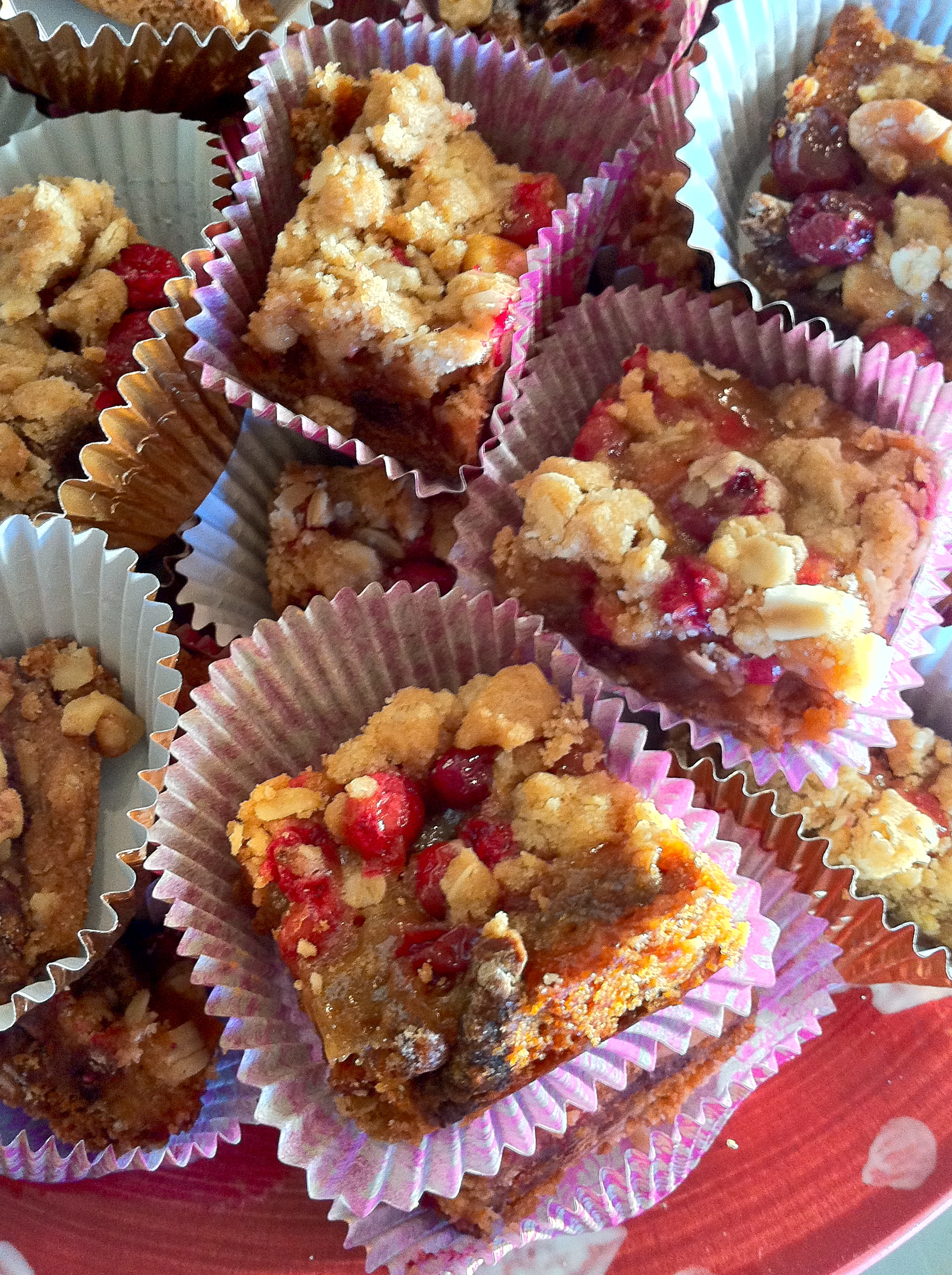 Last night I finished my nursing shift later than expected, and I still had to bake cookies for a Christmas brunch and cookie exchange the next morning. This is my mother’s recipe. She started baking these festive looking bar cookies after I had moved out on my own. I was delighted to discover that not only are they delicious, they are easy and quick to make, which is wonderful when you are short on time. You can really speed things up by using date pieces rather than cutting up whole dates.