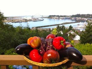 Saturday morning at Newport’s Farmers’ Market we bought heirloom tomatoes, slender eggplants, a radicchio with red leaves edged in light green, and purple, yellow, and red peppers. Although we are traveling, I couldn’t resist the beauty of the vegetables, and when we paid for them even the farmer commented on the remarkable colors. Although he’d set up the booth himself that morning, he saw them from a fresh perspective while weighing them on the scale.