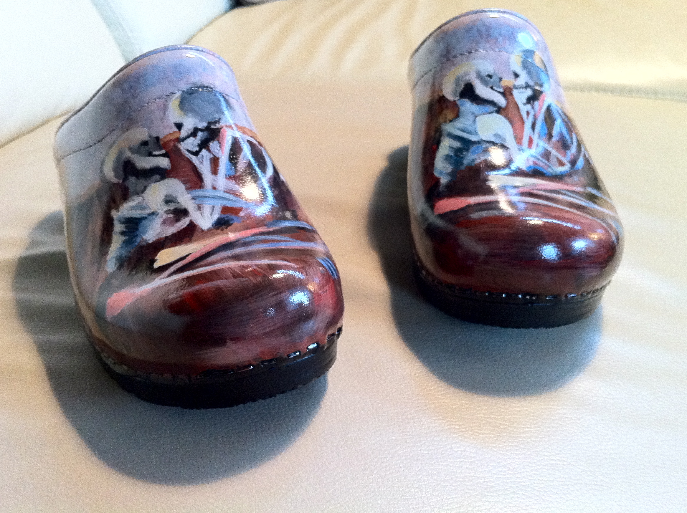 My new custom painted clogs arrived from The Swanx! Cute, huh? I ordered them a few weeks ago. I wanted my painting Love You to Death transferred onto the hand-painted, one of a kind clogs, and Kira did a fabulous job. I chose Love You to Death to commemorate it’s publication On the Cover of the American Journal of Nursing in October 2009.