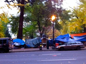Across the street, Lownsdale and Chapman squares were crowded with tents and makeshift shelters of the Occupy Portland movement. I noticed that no one was up yet at the encampment. It must have been a cold night for the protestors.