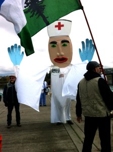 A giant pair of blue hands extended skyward as I ran through Portland’s Waterfront Park Saturday morning. Curious, I adjusted my route to get a closer look. A group of 50 or 60 people gathered around a 20 foot tall representation of a nurse. The giant blue, gloved hands were hers.
