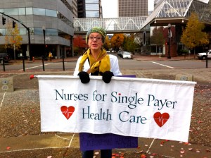 A young woman held a sign which read, Nurses for Single Payer Health Care. She explained the demonstration was part of the Occupy Portland movement, focusing on the need of single payer health care in the United States. She is a twenty-two year old nursing student working with a group of community health nurses promoting health care services for the under served. “I’m the youngest one in the group,” she told me, “but I feel this is really important.”