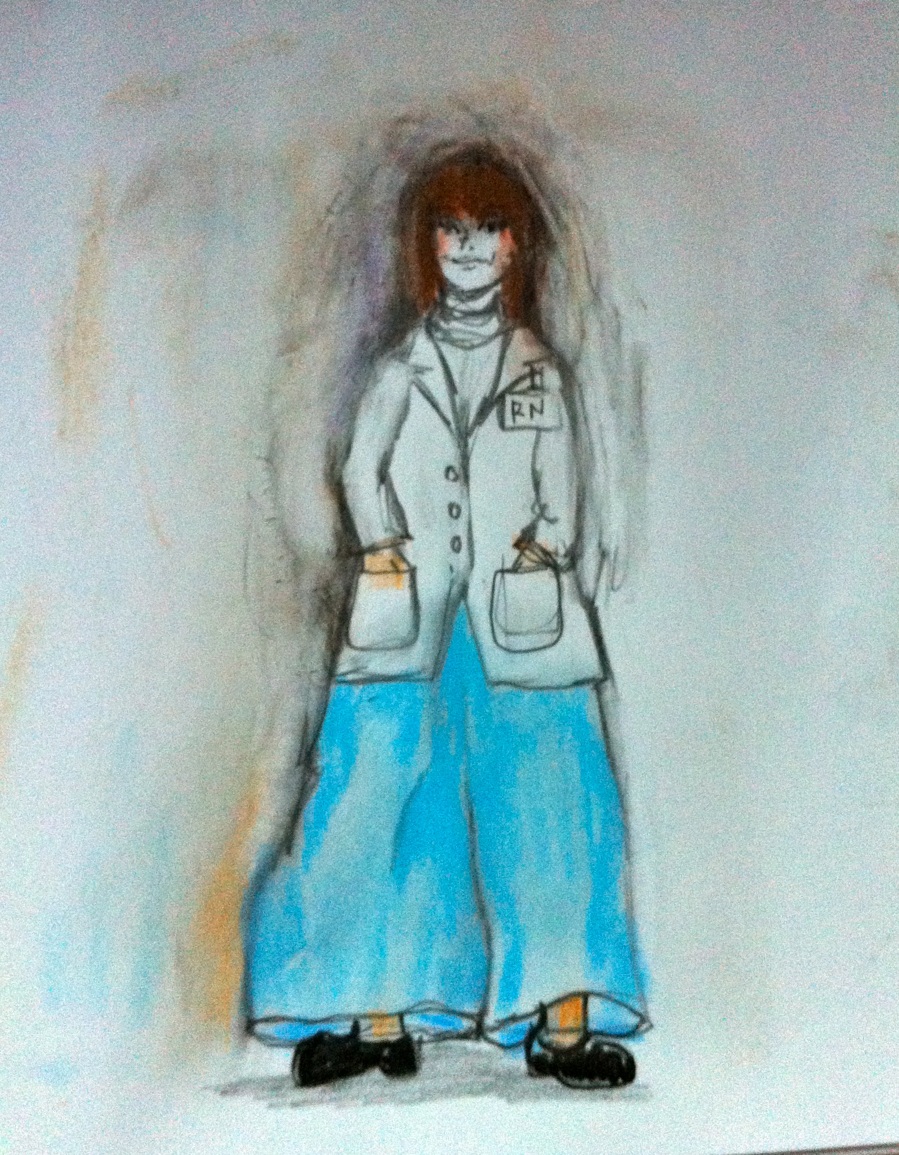 In ambulatory care, patients wear their own clothes. Our linen closet is not stocked with an array of gowns or pajama bottoms; however, I managed to find a pair of XXXL pale blue drawstring pajama bottoms stuffed behind the fitted bed sheets. They were so gi-normous, I had to hike and tie the drawstring waist at my bust line. The pant legs were three times wider than both my legs put together. You can imagine how ridiculous I looked (if you can’t, I drew a picture for you above) even with a white lab coat buttoned over the ensemble to hide it. My coworkers were busy, and unaware of my dilemma. When one noticed, all she could say was, “Uh oh.”