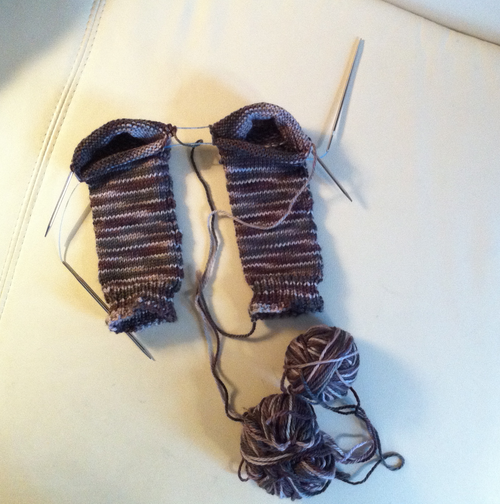 I’m happy to report I have successfully turned both heels. The most vexing problem has been confusing which of the four needle tips to use, then having to rip out and knit again previous rows after doing it wrong. I found one dropped stitch too, which is so far back at the beginning there is no way in hell I will rip out my work to redo it. I’ll simply learn to live with it.