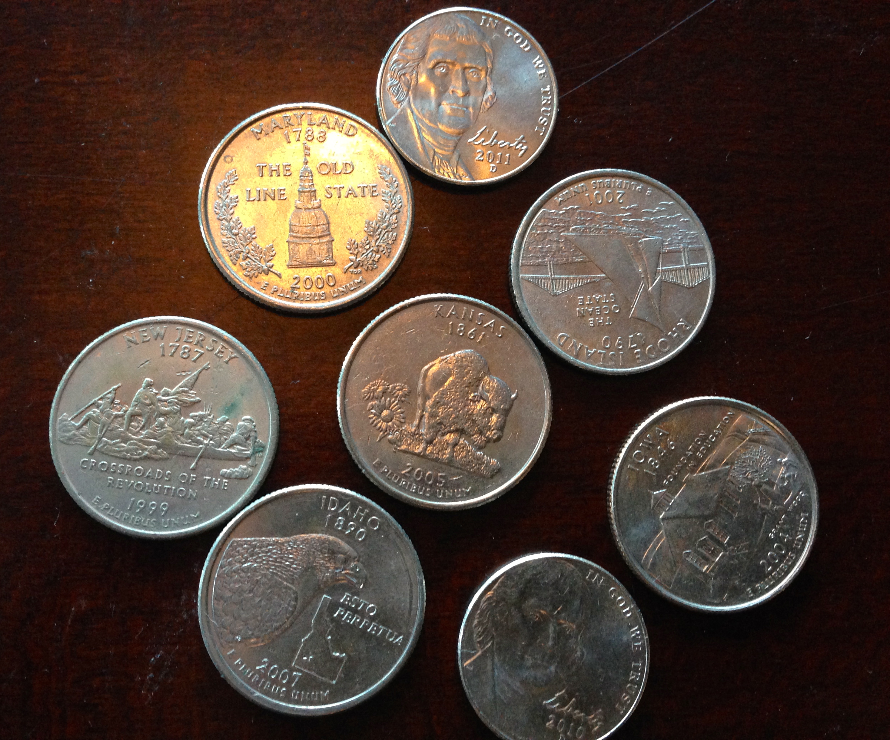 The clerk showed me I had to turn the quarters over to find Washington, and I discovered there is new nickel, which is the Return to Monticello nickel bearing a full-face image of Jefferson, replacing his profile. She waited while I counted out nineteen cents. She said she has a difficult time telling them apart too.