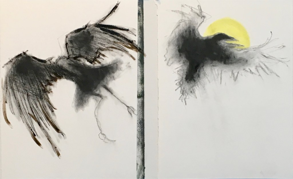 These drawings are inspired by my love of nature, birds, and particularly corvids, those “unpettable pets.”
