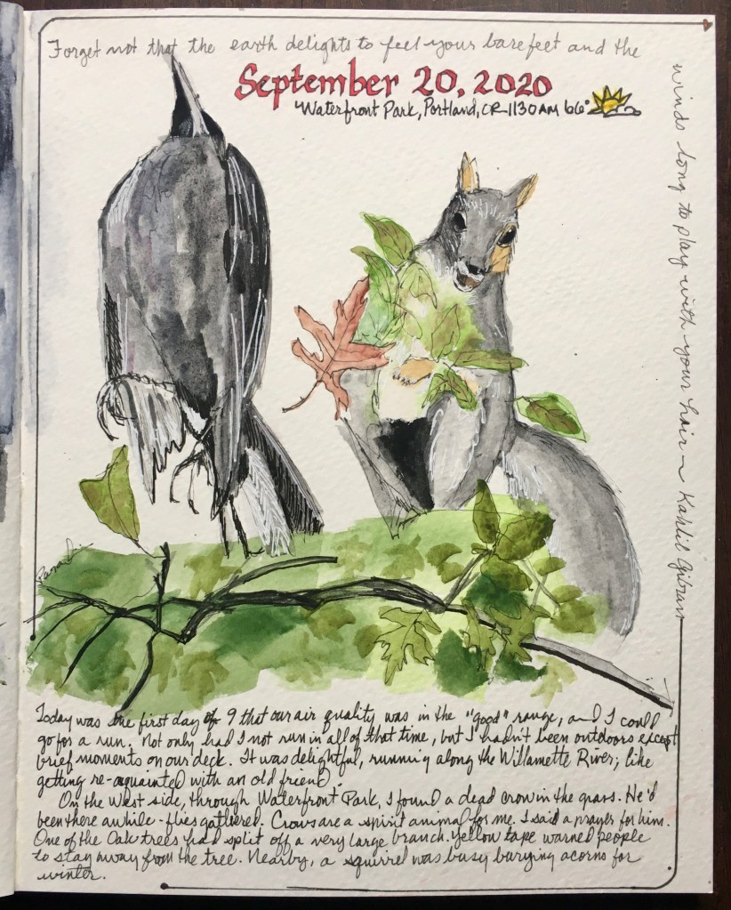 On the westside, through Waterfront Park, I found a dead crow in the grass. He’d been there awhile-flies gathered. Crows are a spirit animal for me-I said a prayer for him.