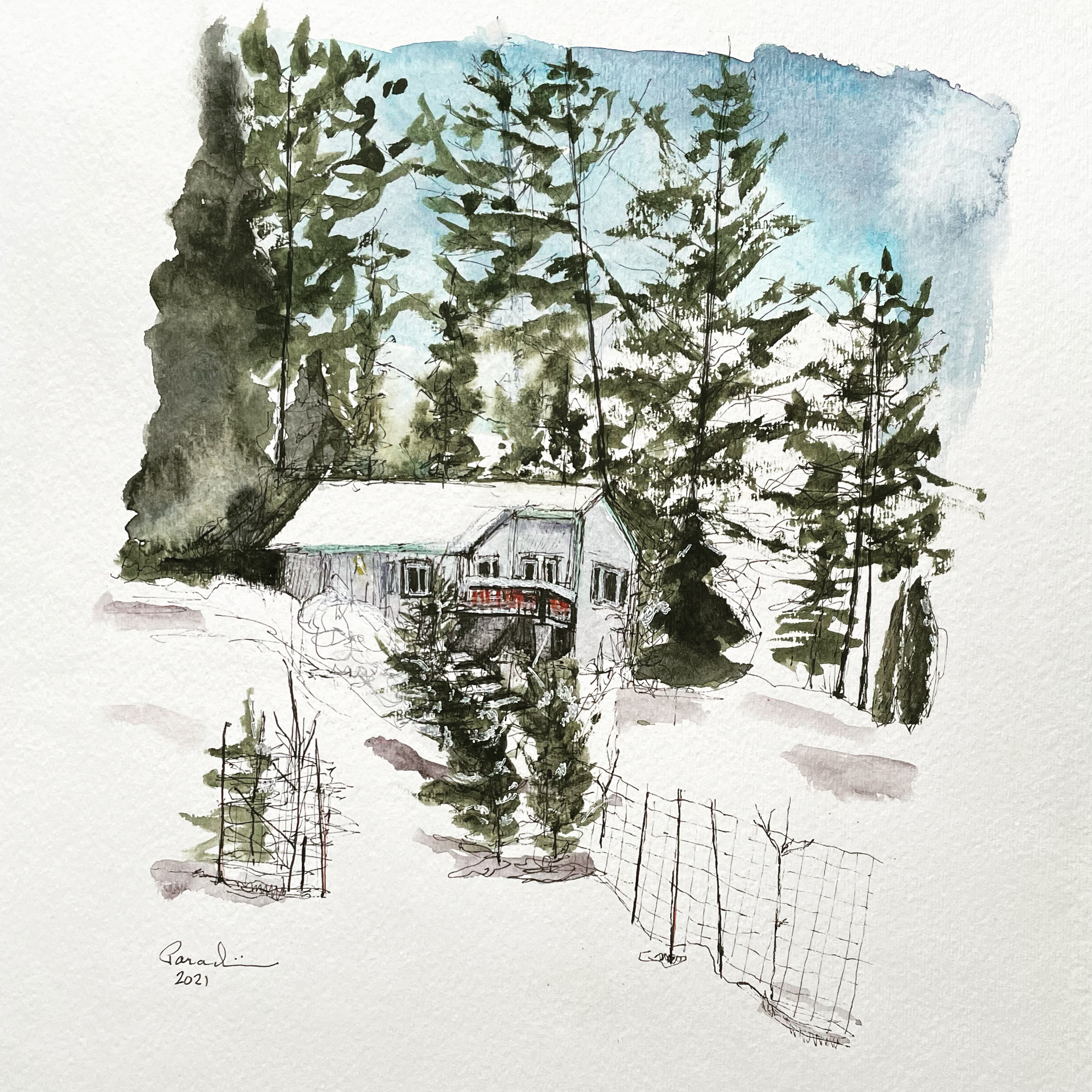 M's and D's Home with Snow, ink and watercolor on paper, 2021 by Julianna Paradisi