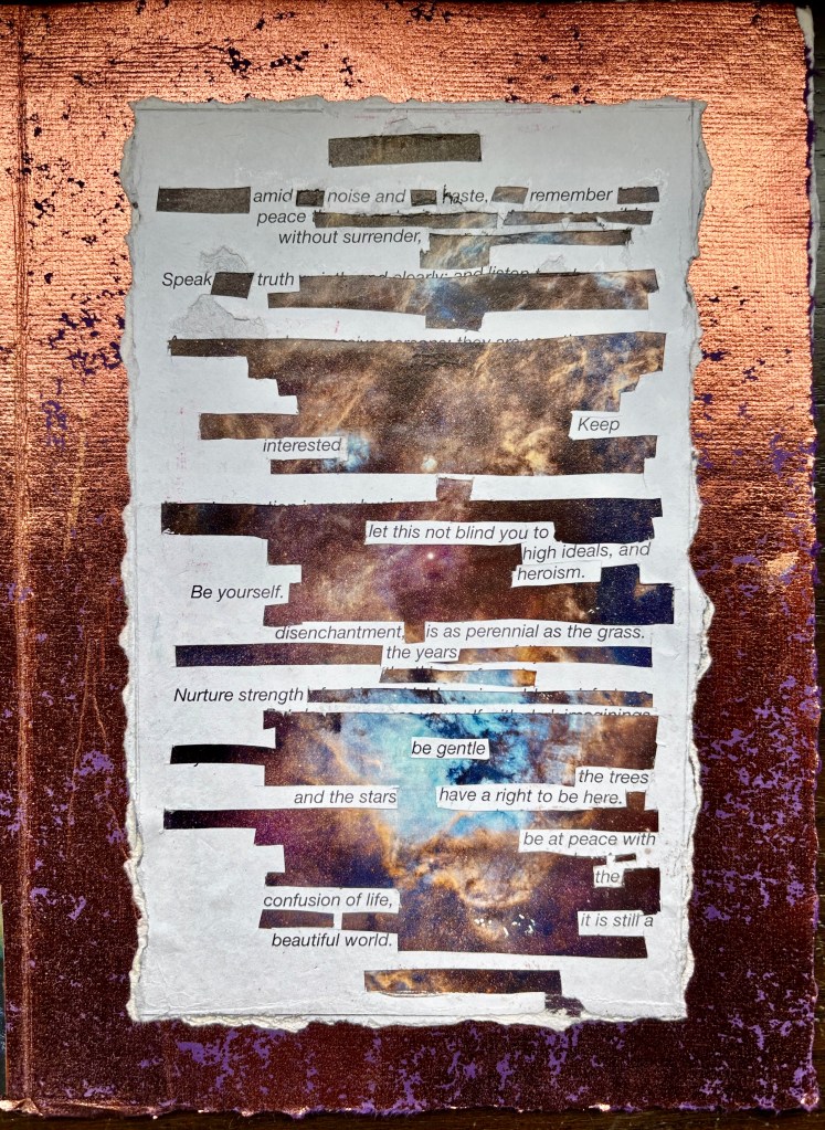 For my reference page I chose the Desiderata, written in 1927 by Max Ehrmann. I first read it around the age of fifteen and the words still hold their meaning. I hesitated to deface this classic, but hoped I would learn something of value from the experience.