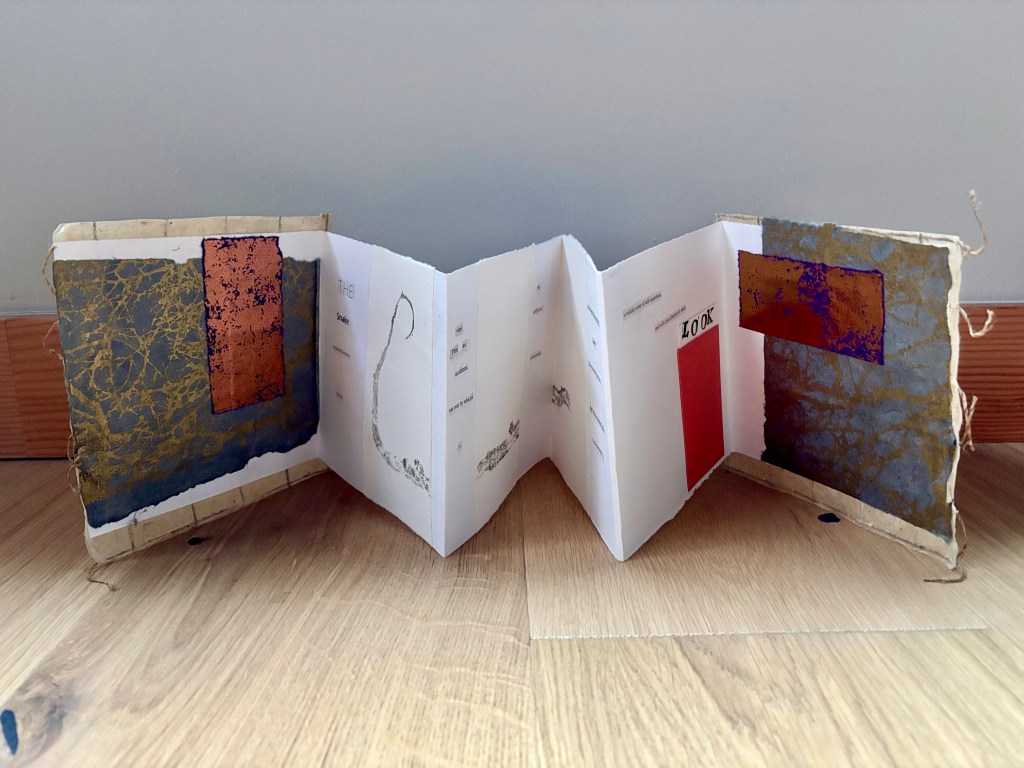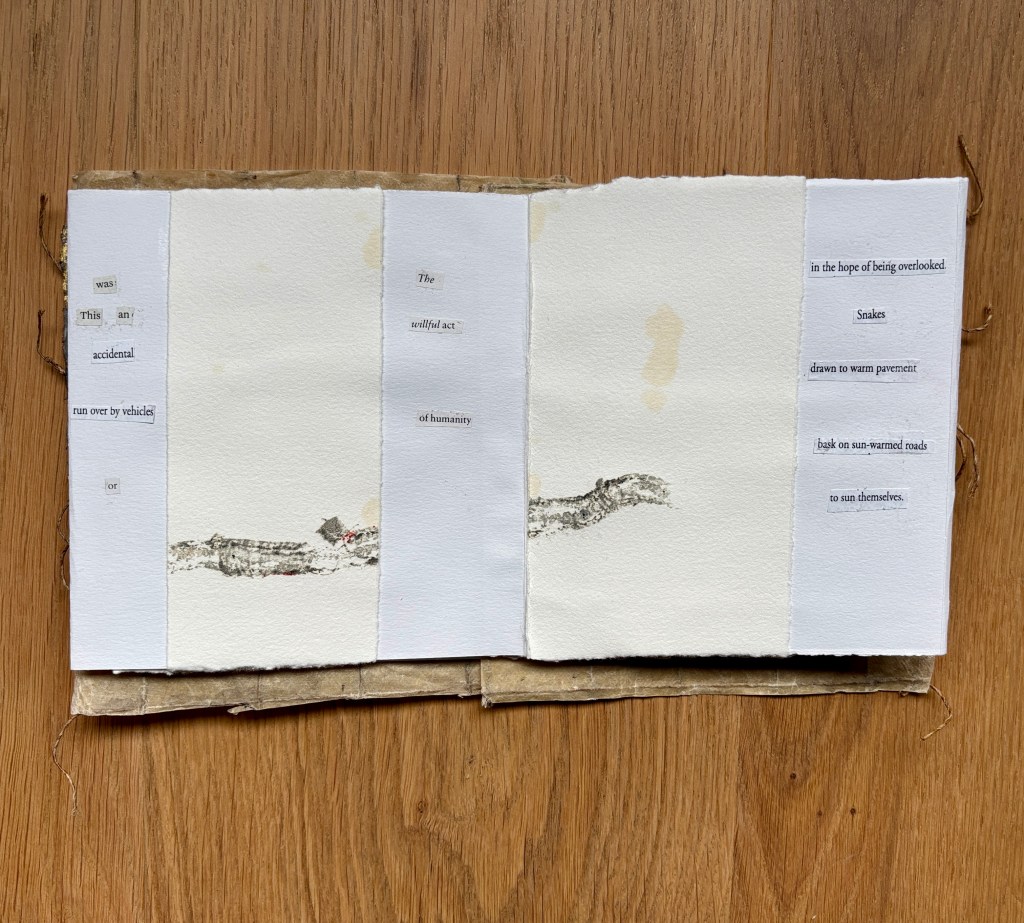 Last year, I took the headless snake to the print making studio, and made a few monotype prints from it before discarding it. I wasn’t sure what I would do with the prints, so they remained in a file until this year when I came up with the idea of writing a found poem about the snake, and expanding on its visual impact by using the snake prints.